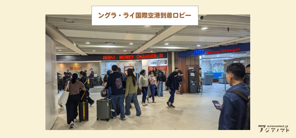 バリのングラ・ライ国際空港の入国審査を終え、ゲートをくぐると写真のような場所に出ます。ここには両替所、ATM、SIMカード、配車など入国時に必要なものがそろっています。