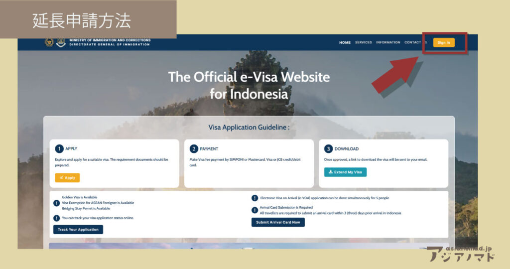 前提として、インドネシアで延長手続きをオンライン申請したい場合は、入国前にアライバルビザをオンラインで取得しておく必要があります(e-VOA)。