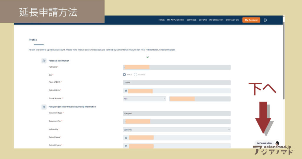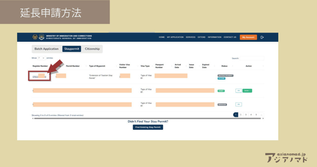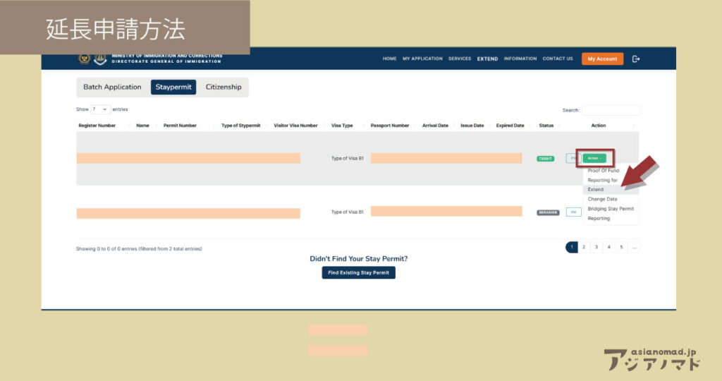 ・入国時に申請したデータの右にある「Action」をクリックし「Extend」をクリック。