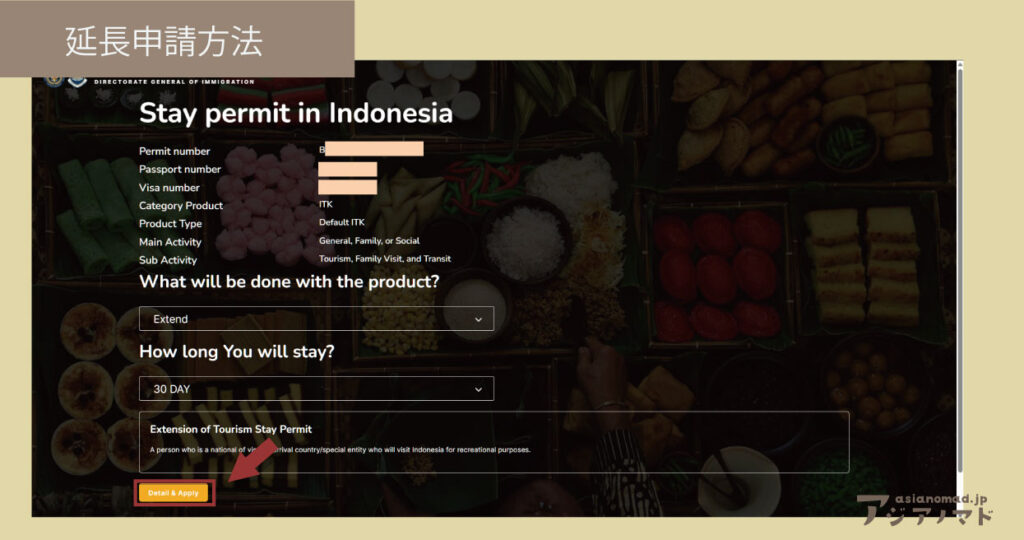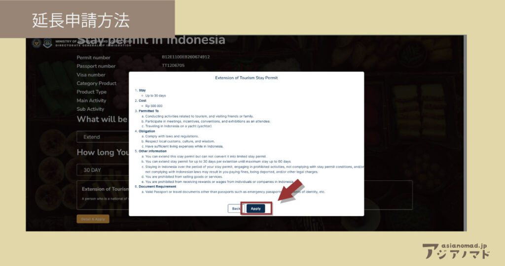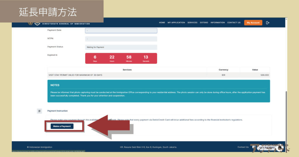 ・延長日数は30日、延長料金はRp500,000などその他注意書きが出ます。