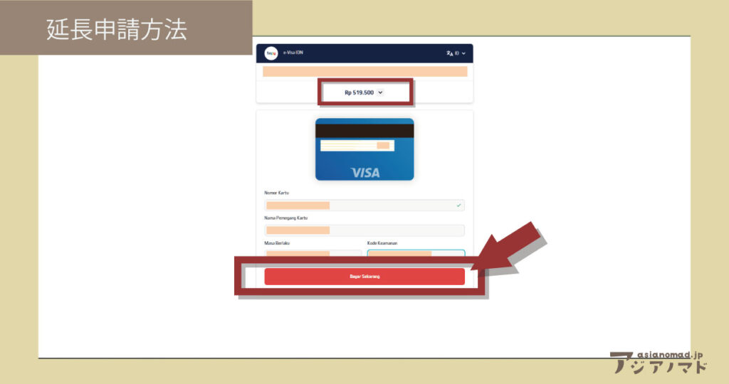 カード情報を入力し、手数料込みの料金Rp519,000をお支払い。