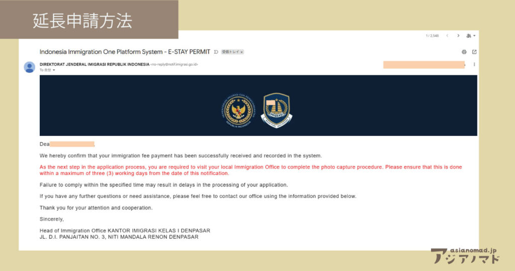 ビザの延長手続きとお支払いが完了すると以下のようなメールが届きます。