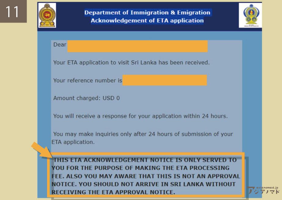 申請を受領したメールがすぐ届きます。申請後、Sri Lanka ETA status Acknowledgement という件名でメールが届きます。