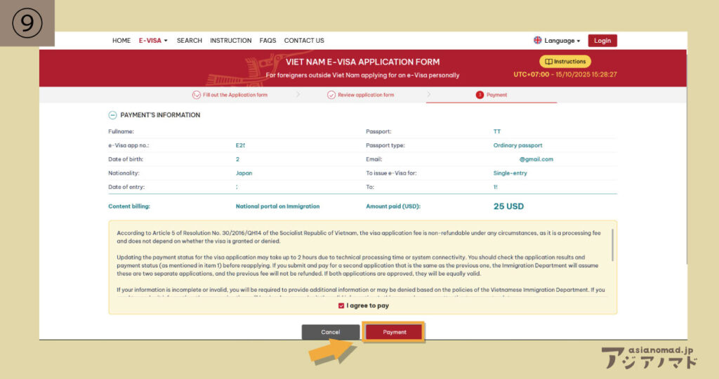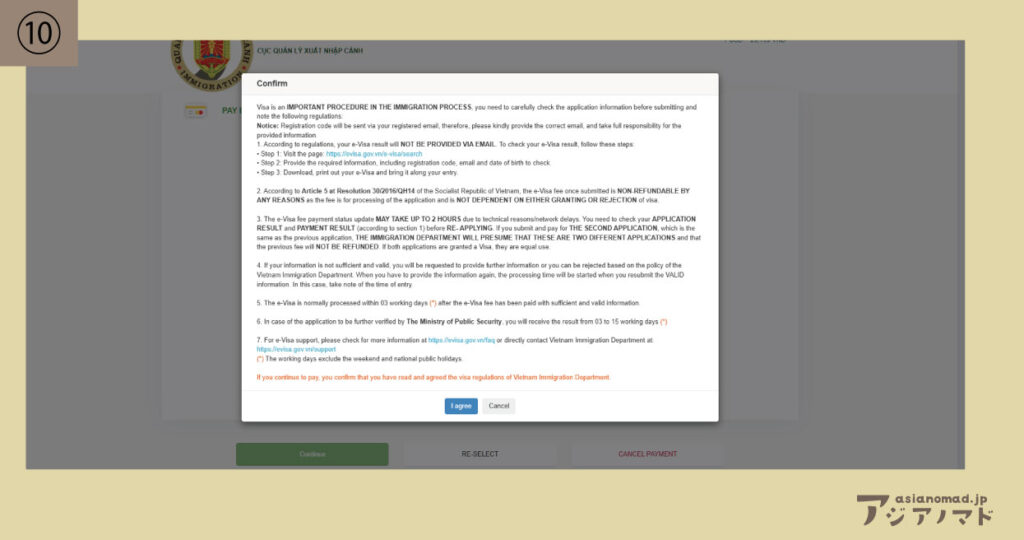 支払いを続行する場合、ベトナム移民局のビザ規制を読み、同意したことになります。