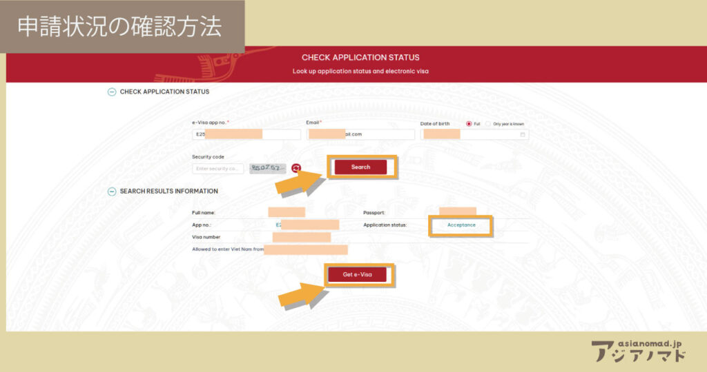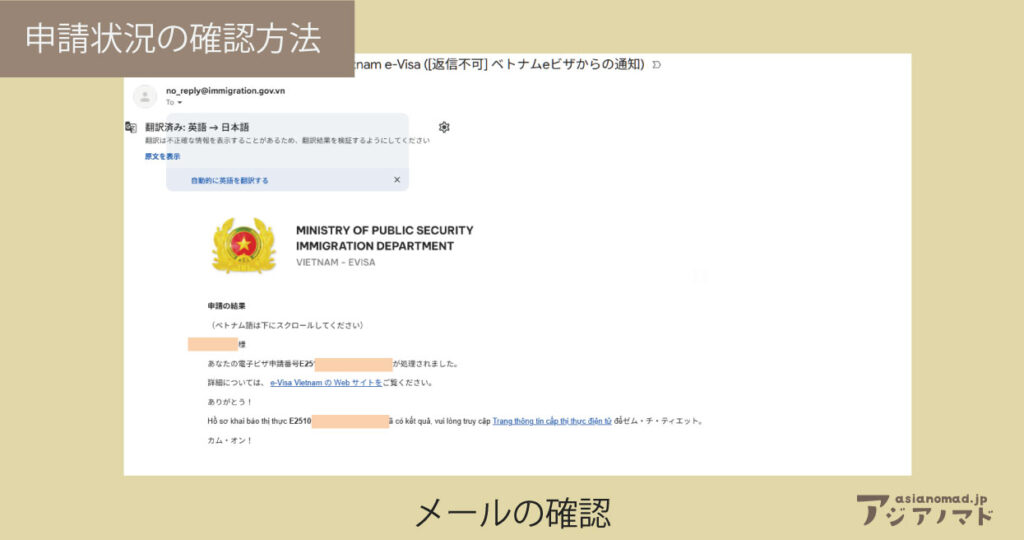 規制によると、e-ビザの結果はメールでは提供されません。e-ビザの結果を確認するには、以下の手順に従ってください。