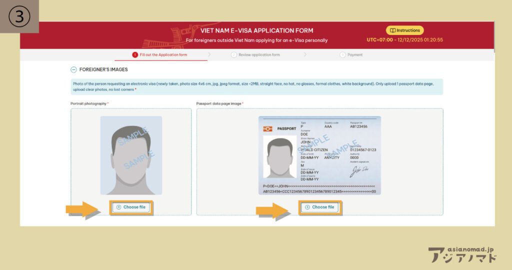 上部の注意書きの内容:電子ビザ申請者の写真(新しく撮影したもの、写真サイズ4x6cm、jpg、JPEG形式、サイズ2MB以内、正面向き、帽子無し、眼鏡無し、フォーマルな服装、白背景)。パスポートデータページは1ページのみアップロードしてください。鮮明で、角が欠けていない写真をアップロードしてください。